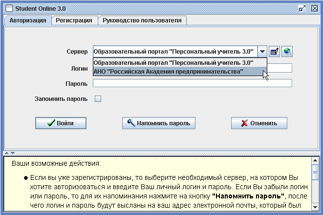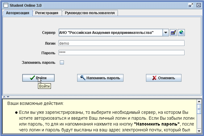 3. В запустившейся программе выбрать сервером «Российскую Академию предпринимательства», ввести ваш логин и пароль (только для обучаемых, для тестового входа используйте демо-вход с параметрами demo/demo) и нажать на кнопку «Войти».