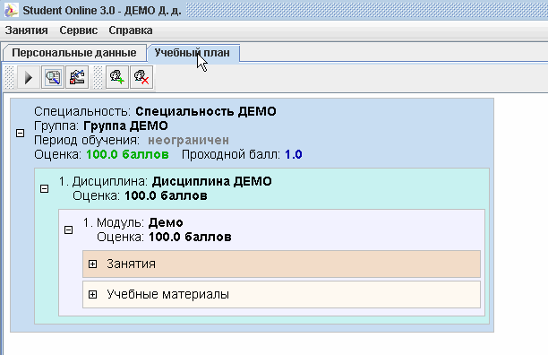 4. После входа в программу, выберете закладку «Учебный план», где будут перечисленны все ваши дисциплины, необходимые для обучения. Занятия начинаются нажатием на треугольник синего цвета.
